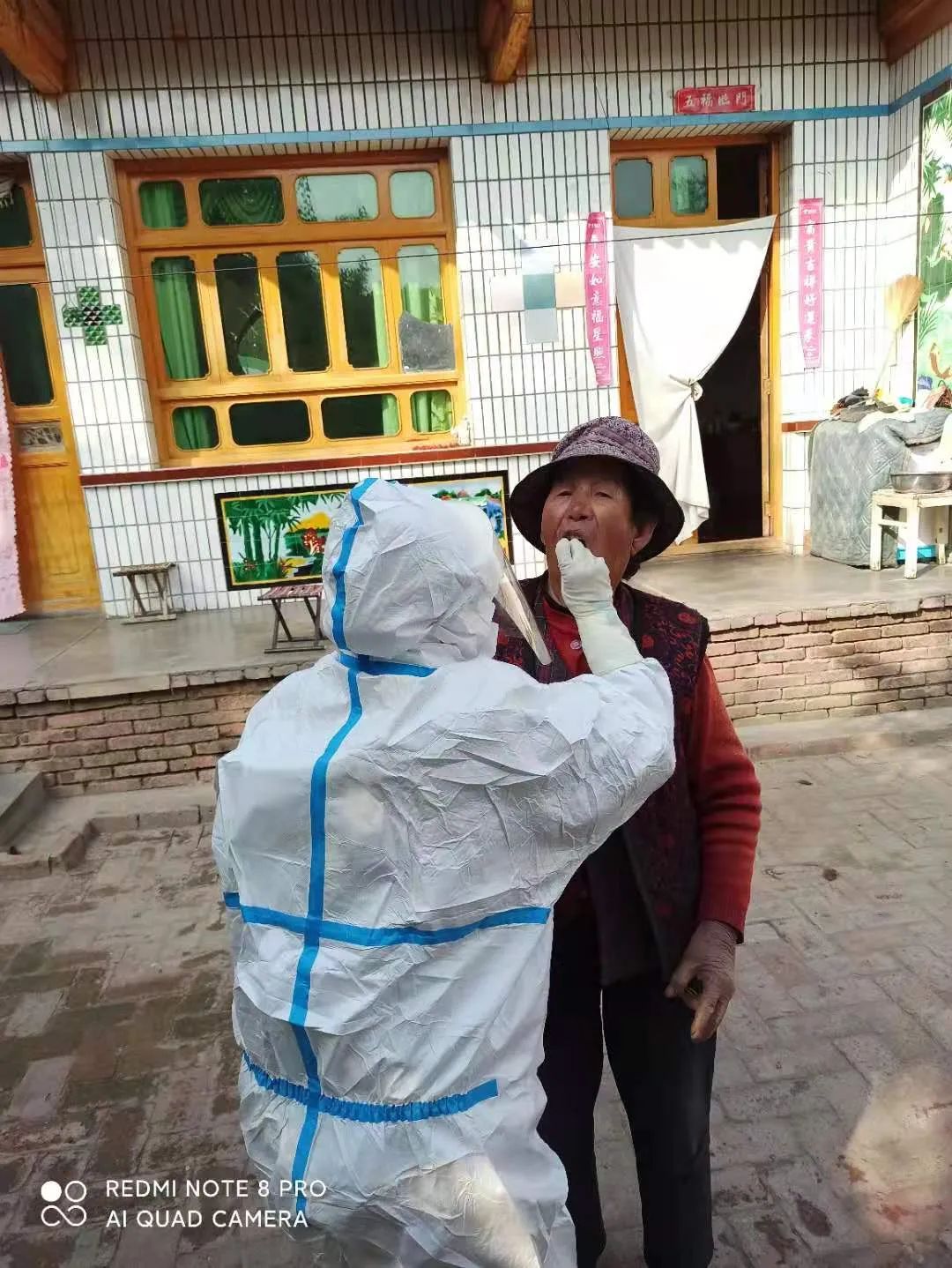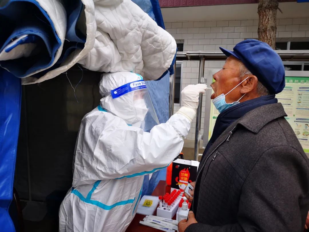 每一輪的第一天都是人數*多的時候,為了按時采集任務,一線人員兩班輪換,部分采集點甚至工作到深夜。山上的氣溫偏低,幾個小時下來,手腳都凍得酸麻。很多村民都不知道如何出示綠碼,管玉和同事會反復叮囑,說話多了,防護罩上布滿了水汽。白天固定采樣點的檢測工作后,管玉和同事就會帶著防護裝備和采樣用品,在當地村干部的帶領下入戶為腿腳不便的老人檢測。