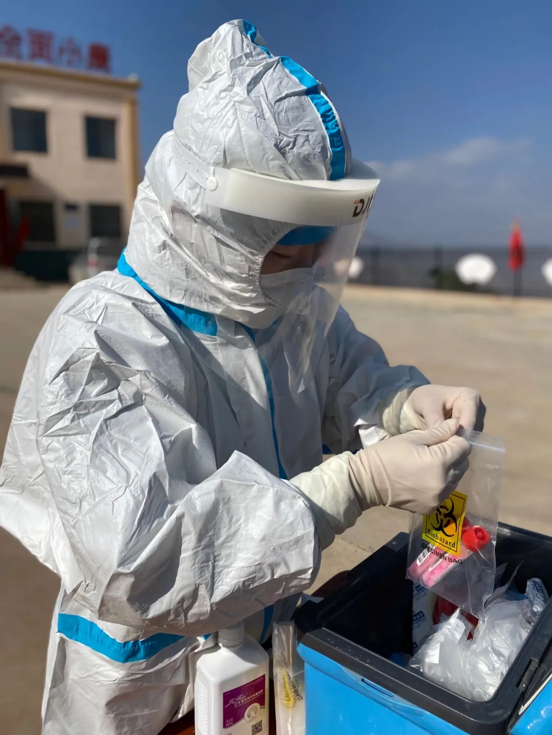 被守護的我們體不到會防護服內一層水、一層霜的艱辛,薄薄的乳膠手套,在進行手消時被酒精帶走了所有熱量。每一輪采集工作,她們與時間賽跑,第一批醫療隊入村采集時,由于各項工作需要與鄉政府和村上協調,醫護人員兩班輪換,持續2兩天所有采集任務。第二輪開始,醫療隊早上6點集結出發,醫院車輛送至山腳下,再由各個村的服務車輛送至采集點,7點半左右開始采集工作,每天持續至晚上11點多,回到家差不多已是凌晨,休息幾個小時后再次出發。